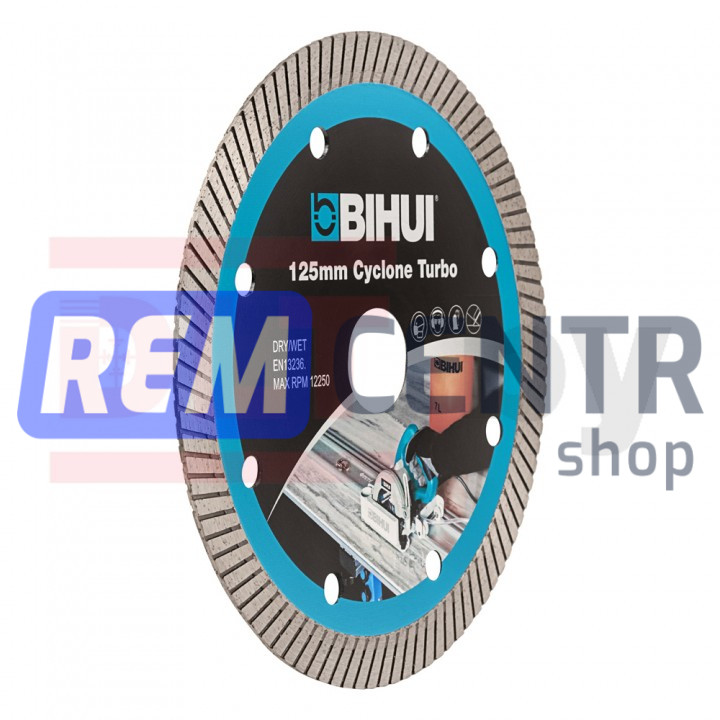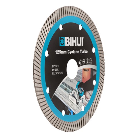 Алмазный диск BIHUI Cyclone Turbo это тонкий диск (толщина 1,5мм) с непрерывной кромкой для деликатной резки керамогранита и твёрдой керамики. Пригоден для сухого и мокрого реза на высокооборотистых станках.