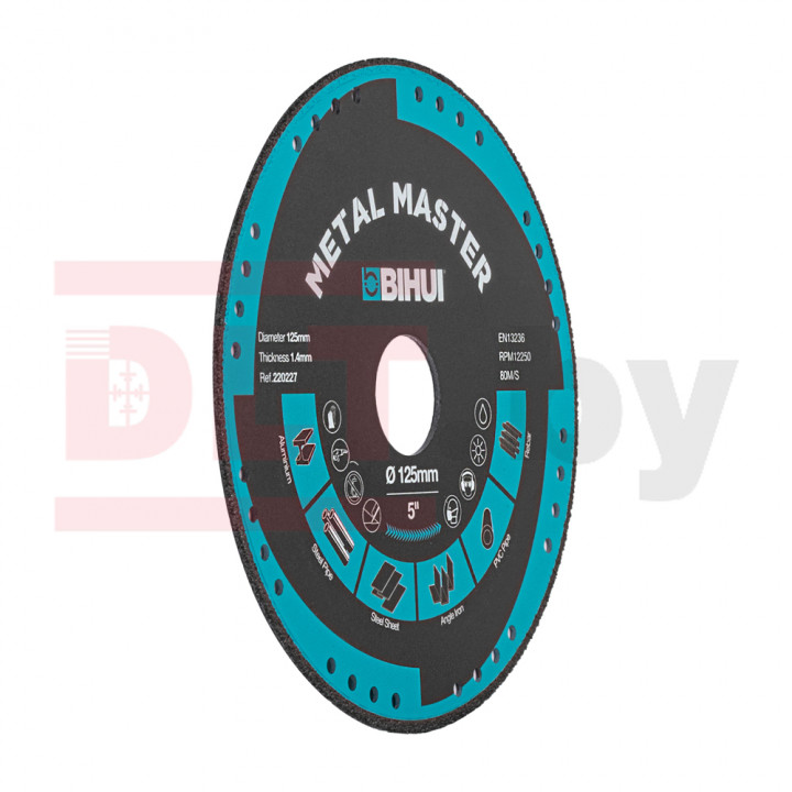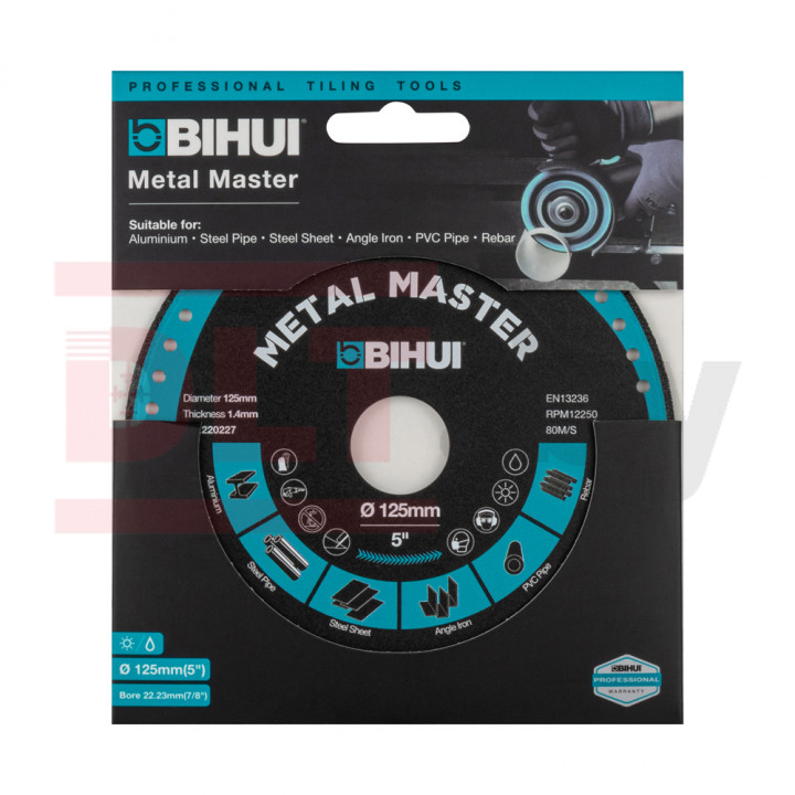 Диск алмазный BIHUI METAL MASTER – изготовлен методом вакуумной пайки. Благодаря этому достигается высокий ресурс диска и устойчивость напайки к истиранию при работе с материалами с различной степенью твердости. Используется для резки стали, цветных металлов, алюминия, пластика. Толщина алмазного слоя 1.4. Резка осуществляется как с применением водяного охлаждения, так и без. Диск подходит для работы на УШМ.