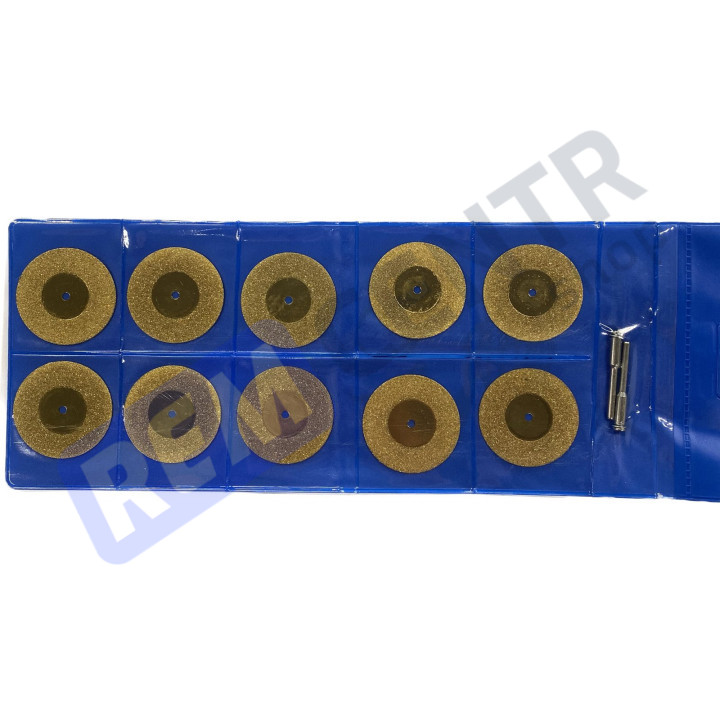 Диаметр дисков 20 мм, диаметр отверстия под оправку 3 мм, толщина алмазной кромки 0,6 мм.