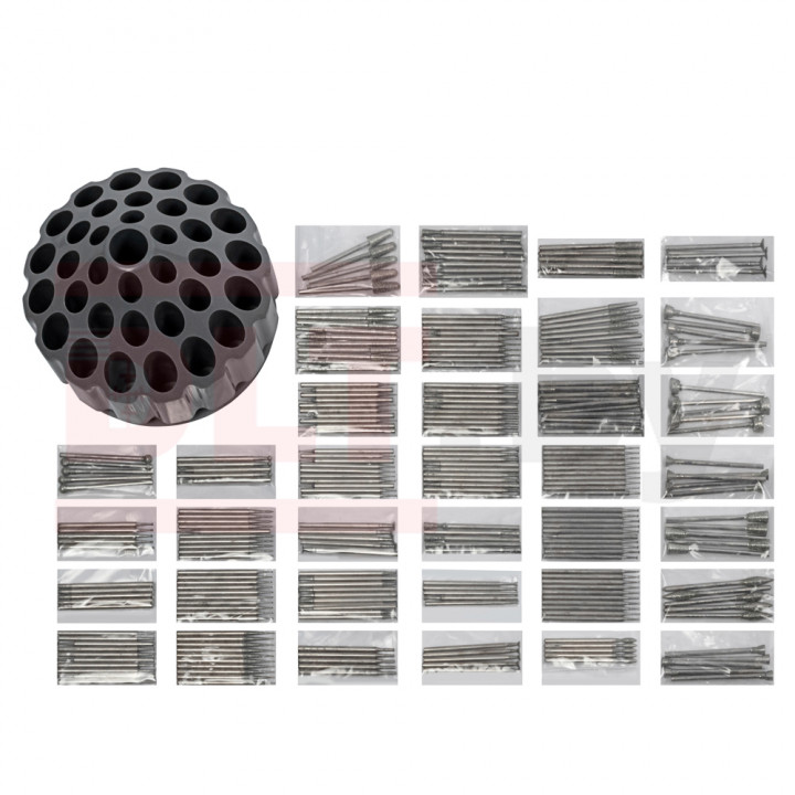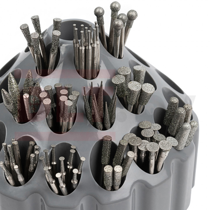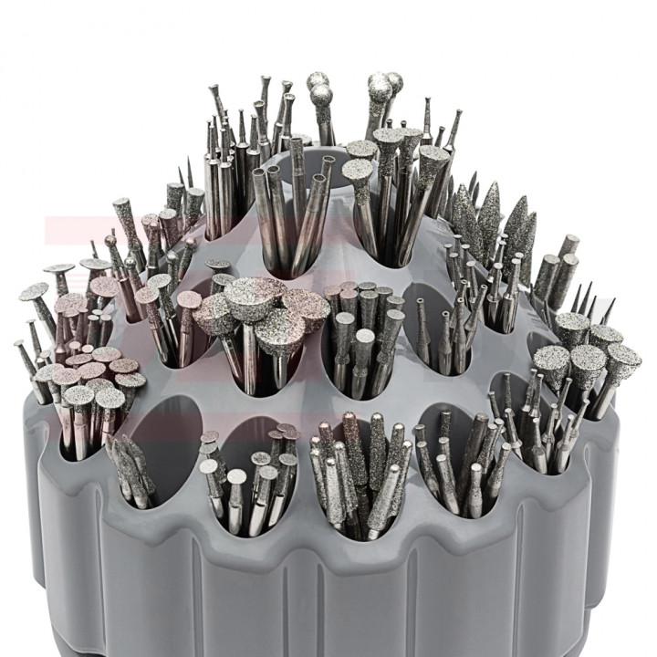 Набор алмазных фрез для гравировальной машинки, 256шт, (шарошки для гравера) применяются для проведения высокоточной обработки цветных металлов, стекла, керамики, керамогранита, пластика и прочих материалов. У всех буров хвостовик 2,3 мм, что позволяет использовать их не только в бор-машинках, но и в гравировальных аппаратах. Равномерное нанесение алмазного порошка на поверхность рабочей части обеспечивает качественную и аккуратную обработку материала без сколов и заусенцев. Нанесение из высококачественных синтетических алмазов. Ассортимент насадок различных форм позволяет обрабатывать самые сложные участки деталей разной конфигурации.