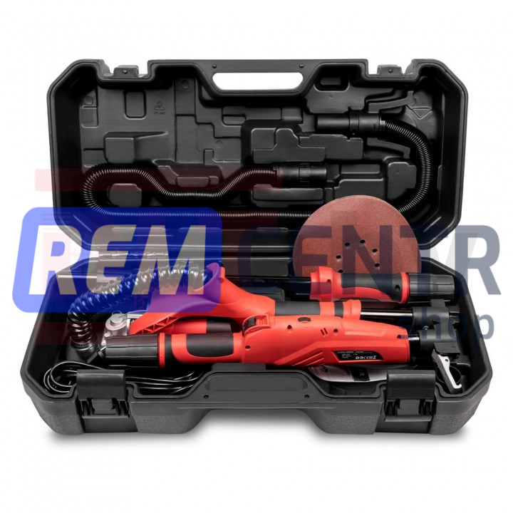 Рабочий блок оборудования (голова) закреплен в подвижном механизме, обеспечивающем свободное перемещение шлифовального механизма в любом направлении. Наличие пылеудаления позволяет извлекать абразивную пыль непосредственно из шлифовального диска и засасывать её через шланг, в пылесос, оставляя чистой рабочую зону без образования раздражающей пыли. Ручка оборудования может быть сложена пополам для удобной транспортировки, а также экономии места при хранении.