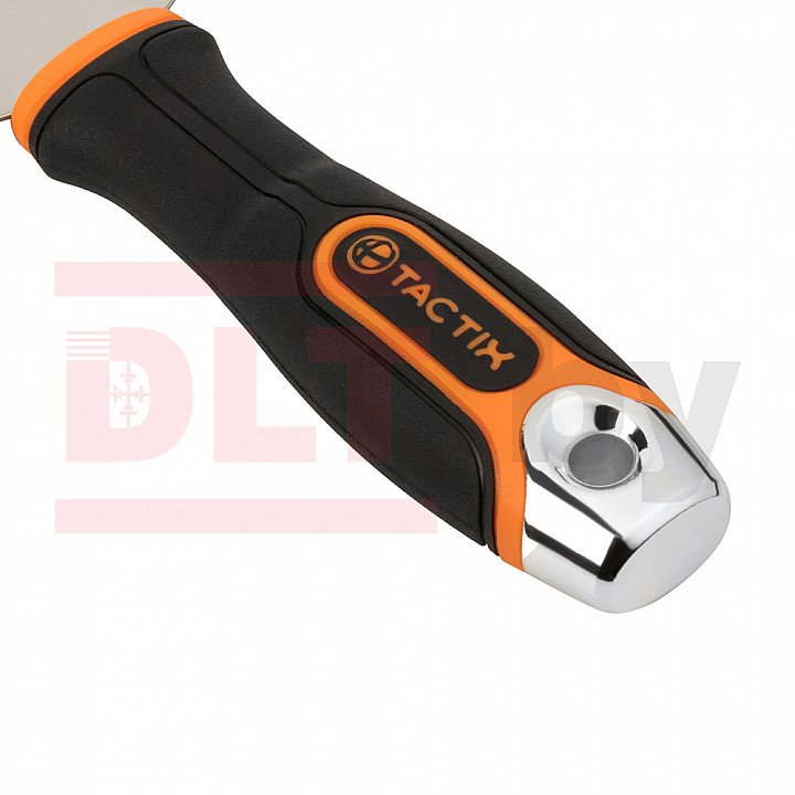 Скребок-шпатель малярный шириной 75мм TACTIX поможет справиться с разными задачами в строительстве и ремонтных работах, поможет при зачистки поверхностей и т.д. Смесь и растворы не прилипают к полотну, легко удаляются с инструмента. Скребок-шпатель оснащен прочным полотном из нержавеющей стали толщиной 1.1 мм обеспечивая устойчивость к коррозии на протяжении всего срока эксплуатации и удобной ручкой с прорезиненными вставками предотвращая скольжение и обеспечивая удобный захват. Усиленное, ударопрочное основание рукоятки можно использовать для забивания.