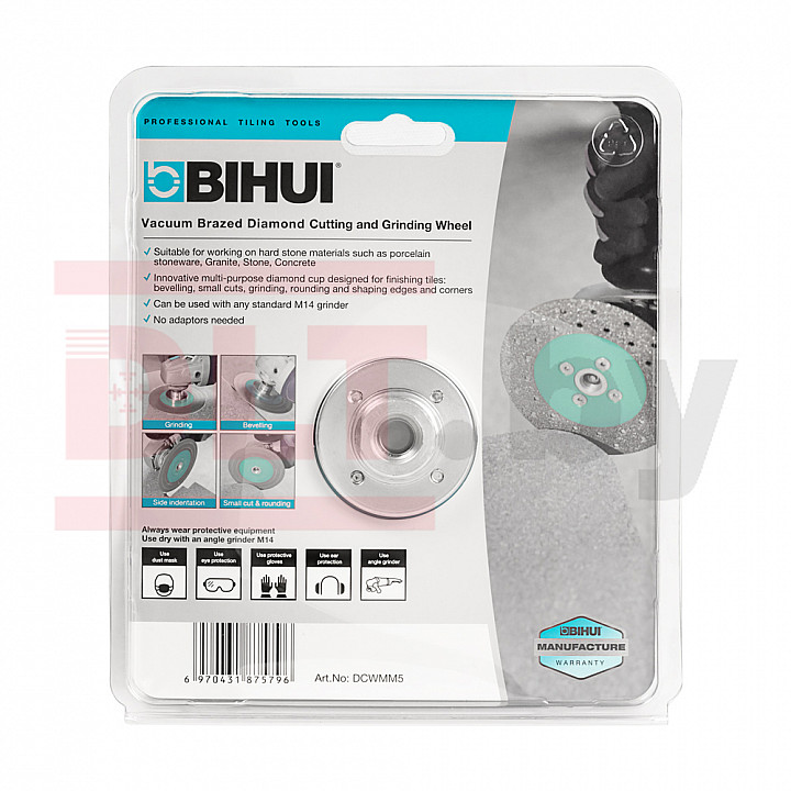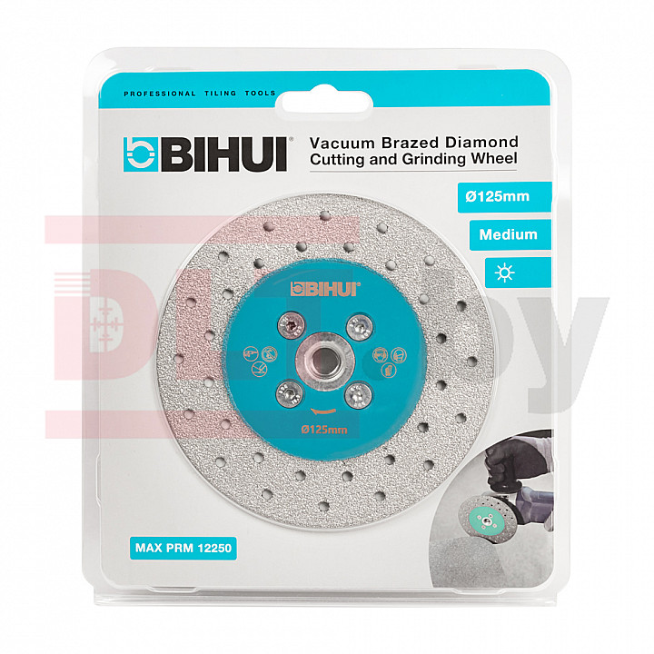 BIHUI VACUUM является диском 2 в 1. Диск предназначен для резки и шлифовки всех видов керамической плитки, натурального и искусственного камня. Алмазы нанесены на диск, с двух сторон, что увеличивает скорость резки, значительно увеличивает удобство обработки и продлевает ресурс диска поскольку его можно переворачивать после того как будет выработана его внешняя часть.